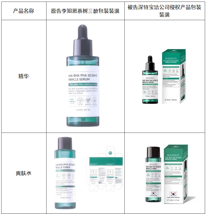 2021年原告委托澳客调查发现,被告汕头市深特宝洁实业有限公司生产、销售和推广的“茶树祛痘美白补水液”“茶树香皂”等护肤品,其产品包装装潢直接抄袭、摹仿原告前述已经具有较高知名度和影响力的“SOME BY MI/莎柏蜜”茶树三酸系列化妆品和黑蜗牛精华液的包装、装潢设计,使用与之近似的标识,造成消费者混淆误认。故原告作为茶树三酸、黑蜗牛精华包装装潢权益获益人,诉至广东省汕头市中级人民法院。汕头中院认定:李知恩主张的茶树三酸、黑蜗牛精华包装装潢构成具有一定影响的包装装潢,深特宝洁公司生产、销售茶树三酸、黑蜗牛精华液的行为构成不正当竞争。因判赔额不符合原告预期,原告后上诉至广东省高级人民法院,广东省高级人民法院最终维持一审判决。